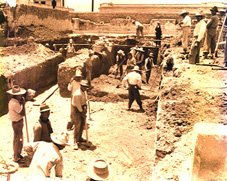 ![]() Avanzando los trabajos del monumental Palacio Nacional. Al fondo el antigüo Edificio de Turismo. Año 1939. Foto: Rafael Morales Sánchez. | ![]() Trabajos de cimentación del Palacio Nacional en el año 1939. Foto: Rafael Morales Sánchez. |