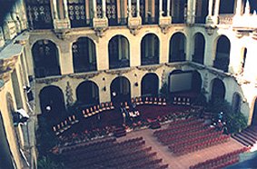 ![]() Vista panorámica de un de los gradiosos patios del Palacio Nacional, tomada con un lente gran angular ojo de pez. Rafael Morales Sáchez. | ![]() Vista panorámica de los arriates del Patio Principal, esquina suroeste. |