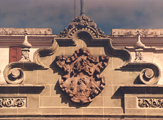 ![]() Escudo en relieve de la Ciudad de Santiago de los Caballeros de Guatemala. Lado norte del Patio Principal. | ![]() Escultura de una armadura tallada en yeso y adornada con laminilla de oro, situada en el Salón de Banquetes. |