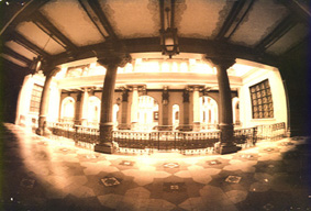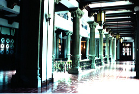 ![]() Toma panorámica de uno de los corredores donde se aprecian las barandas. Foto: Rafael Morales Sánchez. | ![]() Vista panorámica de uno de los corredores, sobresalen las pilastras, lámparas y decoración del techo. Foto: Rafael Morales Sánchez. |