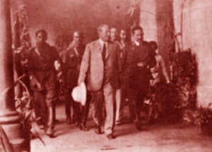 ![]() El General Ubico acompañado de varios militares, en una gira departamental de 1934, a la derecha el General Miguel Ydígoras Fuentes. |