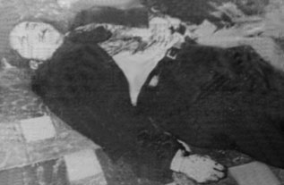 ![]() Fotografía de Carlos Castillo Armas en el lugar donde fue asesinado, en el interior de la Casa Presidencial. |