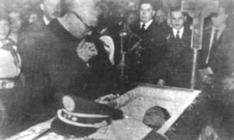 ![]() Monseñor Mariano Rosell Arellano durante la velación de Carlos Castillo Armas, en el Salón de Recepciones del Palacio Nacional. |