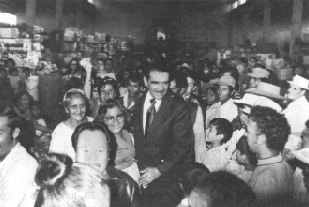 ![]() El general Fernando Romeo Lucas G. en plena campaña electoral en la visita al mercado del Parque Colón de la Ciudad. El Slogan de la campaña era: "Yo ofrezco para el Pueblo de Guatemala un pan del tamaño de su hambre..." |