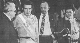| Dirigentes de los partidos Democracia Cristiana y Frente Unido de la Revolución en las elecciones de 1974. En orden aparecen los licenciados Manuel Colom Argueta, Alberto Fuentes Mohr y Vinicio Cerezo Arévalo apoyando al general Efraín Ríos Montt. |