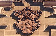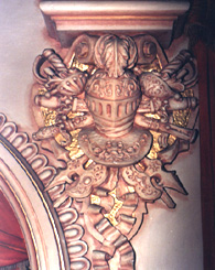 ![]() Escudo en relieve de la Ciudad de Santiago de los Caballeros de Guatemala. Lado norte del Patio Principal. | ![]() Escultura de una armadura tallada en yeso y adornada con laminilla de oro, situada en el Salón de Banquetes. |