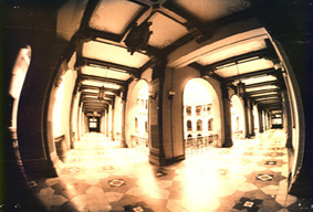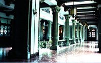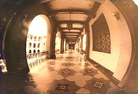 ![]() Toma panorámica de uno de los corredores donde se aprecian las barandas. Foto: Rafael Morales Sánchez. | ![]() Vista panorámica de uno de los corredores, sobresalen las pilastras, lámparas y decoración del techo. Foto: Rafael Morales Sánchez. |