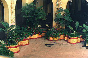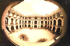 ![]() Vista panorámica de un de los gradiosos patios del Palacio Nacional, tomada con un lente gran angular ojo de pez. Rafael Morales Sáchez. | ![]() Vista panorámica de los arriates del Patio Principal, esquina suroeste. |