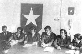 | Dirigentes de los partidos Democracia Cristiana y Frente Unido de la Revolución en las elecciones de 1974. En orden aparecen los licenciados Manuel Colom Argueta, Alberto Fuentes Mohr y Vinicio Cerezo Arévalo apoyando al general Efraín Ríos Montt. |