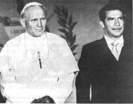 | Su santidad Juan Pablo II durante su primera visita a Guatemala acompañado del Presidente Efraín Ríos Montt. |